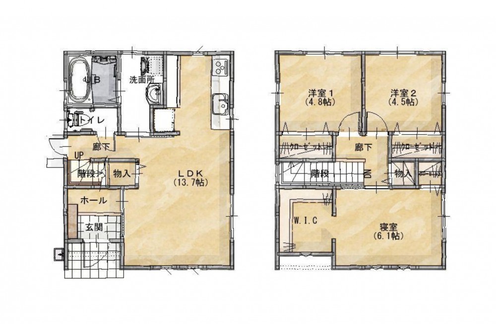 - 側溝、システムキッチン、食器洗浄乾燥機、IHクッキングヒーター、オール電化、洗浄便座、浴室乾燥機、複層ガラス、ウォークインクローゼット、駐車場2台分