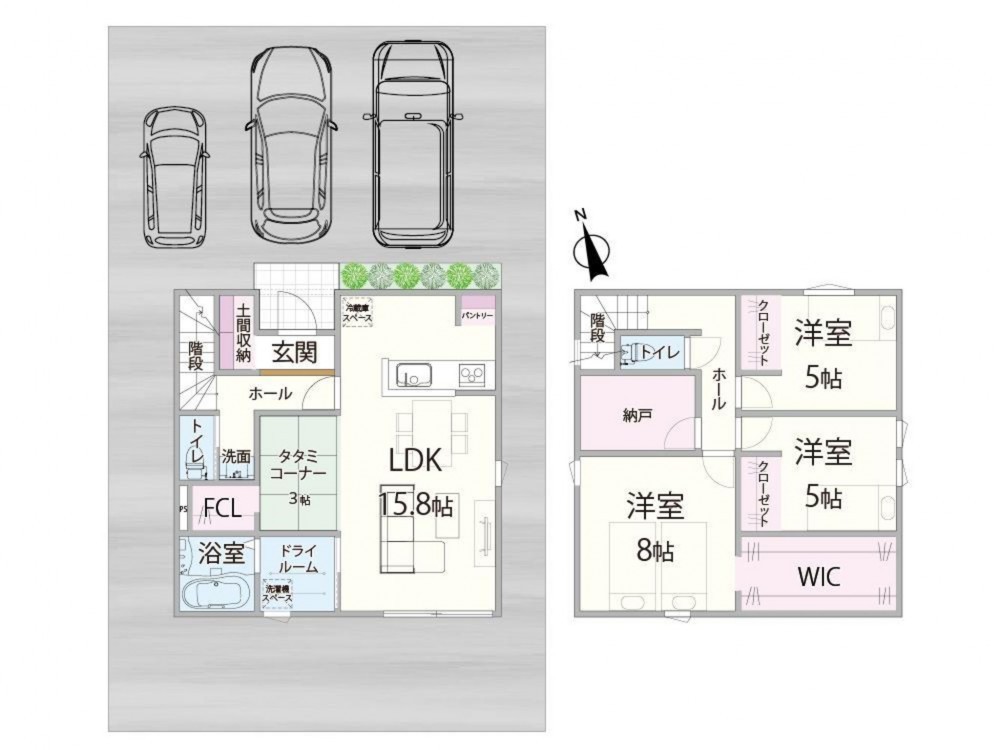 - 側溝、システムキッチン、カウンターキッチン、食器洗浄乾燥機、IHクッキングヒーター、オール電化、シャンプードレッサー、洗浄便座、浴室乾燥機、追い焚き、複層ガラス、ウォークインクローゼット、モニタ付インターホン、ペット可、1BOX駐車可、駐車場3台分、トイレ2箇所