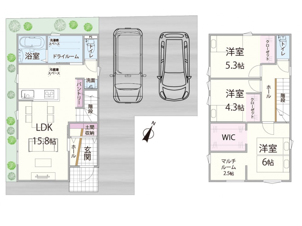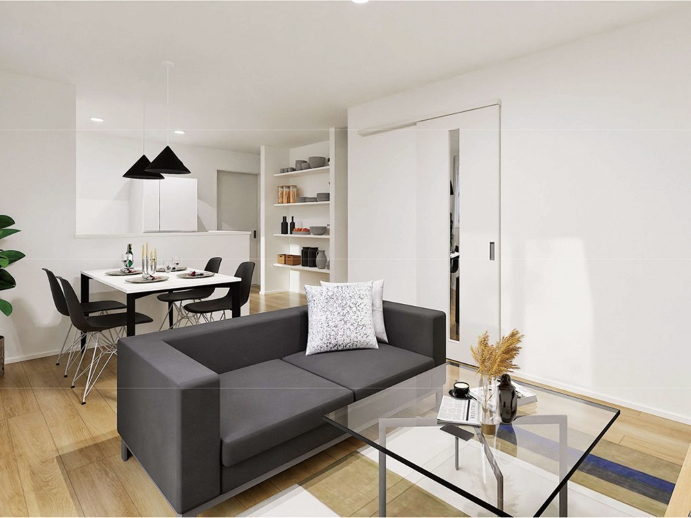 - 側溝、システムキッチン、カウンターキッチン、食器洗浄乾燥機、IHクッキングヒーター、オール電化、シャンプードレッサー、洗浄便座、浴室乾燥機、追い焚き、複層ガラス、ウォークインクローゼット、モニタ付インターホン、ペット可、1BOX駐車可、駐車場2台分、エコキュート、トイレ2箇所